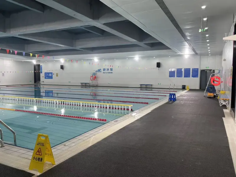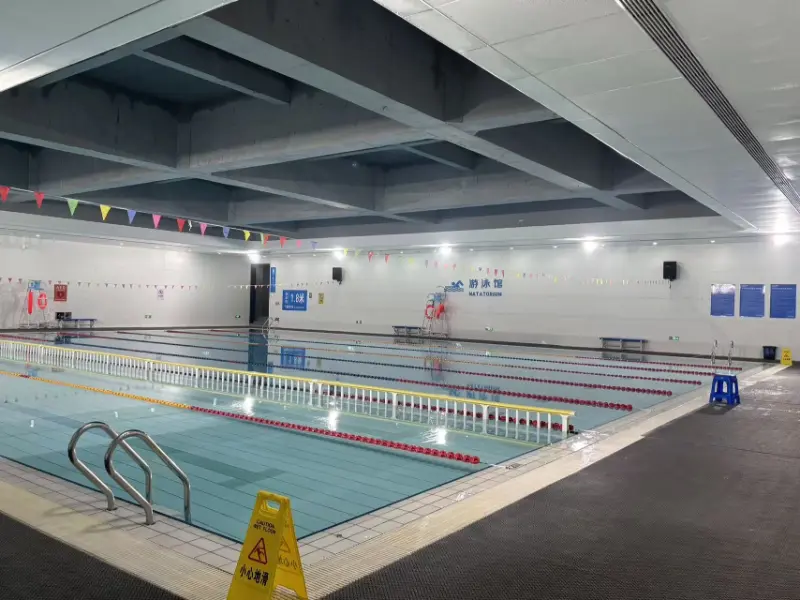 Exterior lacus piscinae metallicae tabulae scalae delineatae est, efficiens effectum scalae lucis et umbrae, quae cum curvatura frontis et directione solis mutatur, augens "fluxus aquae". Tota tecta structura piscinae umbraticae areae aperta est, cum truss spanning 48 metrorum, exprimens expressam expressionem structurae logicae et confirmat scalam localem et sensum virtutis gymnasiorum visneti. Venue domuum duo piscinae: contentio piscina et disciplina piscinae. Certamen stagnum est 50 metra longum et 25 metra latum cum 8 laneis; Disciplina piscinae 50 metra longa est et 17 metra lata cum 6 vicis. Utraeque piscinae sunt 2 metra altae.